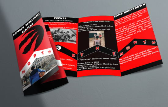 One of my assignments in semester 2 was to create a brochure, I decided to create a brochure that was based off of the Toronto Raptors kids basketball camp.