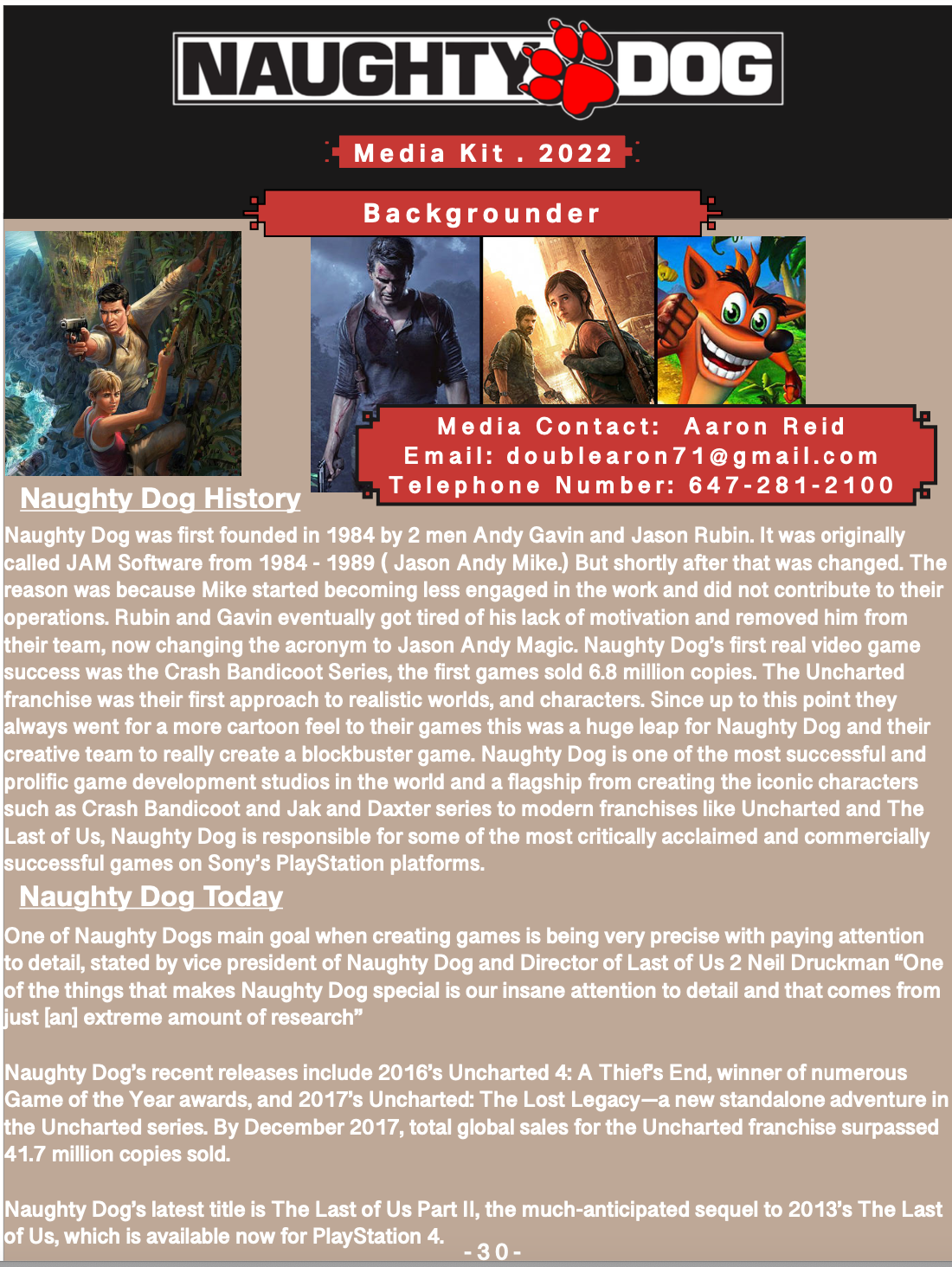 Created a media kit for Naughty Dog a popular video game company who has created some of the greatest games of our time.