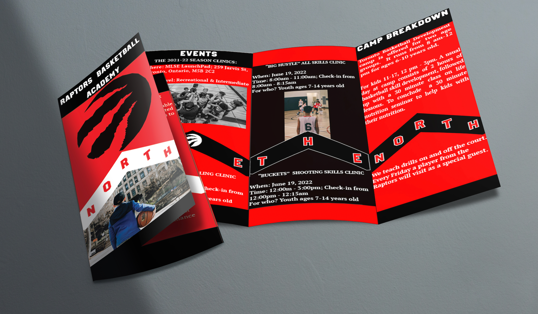 One of my assignments in semester 2 was to create a brochure, I decided to create a brochure that was based off of the Toronto Raptors kids basketball camp.